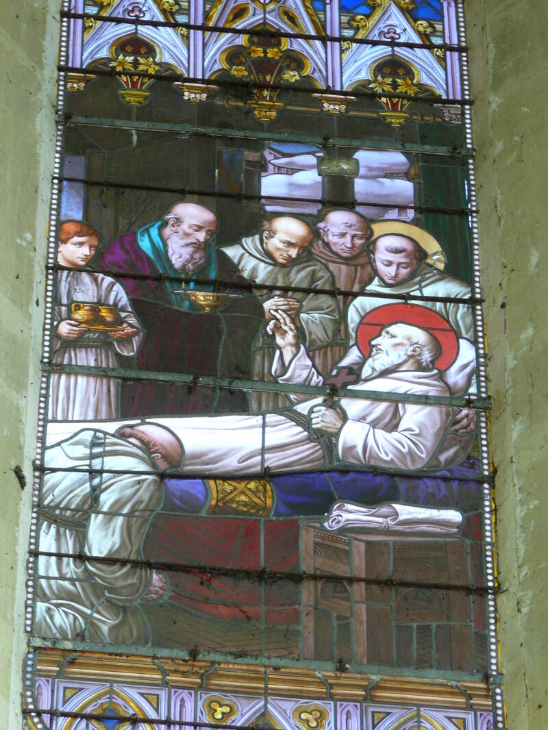 Deux grands vitraux du choeur sont particulièrement intéressants car ils témoignent également de la dévotion de notre paroisse à son saint patron. Ils sont la réplique de vitraux existant à Remiremont et à Uxegney. Il s'agit du départ de Romaric de la cour de Metz pour se retirer dans les Vosges, vitrail de gauche et de la mort de Saint Romaric (653) à droite. Les vitraux originaux auraient été réalisés par Emmanuel Champigneulle , maitre verrier à Bar le Duc et restaurés par Gabriel Loire en 1949